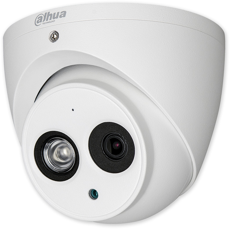 Venkovní IP dome eyeball kamera s fixním objektivem 2,8 mm (úhel 104°), IR přísvit do 50 m. Zabudovaný mikrofon. Rozlišení 4 Mpix (2688 x 1520 px) s frekvencí 25 snímků/s. Kódování H.265+. Funkce WDR (120 dB) a 3D-DNR zvyšující kvalitu obrazu v náročných světelných podmínkách. Kamera je vybavena 4 typy inteligentních detekcí (detekuje průchod, překročení, chybějící a přidaný objekt, tváře). Otáčení ve třech osách. Ukázková videa výrobce Dahua na youtube.
