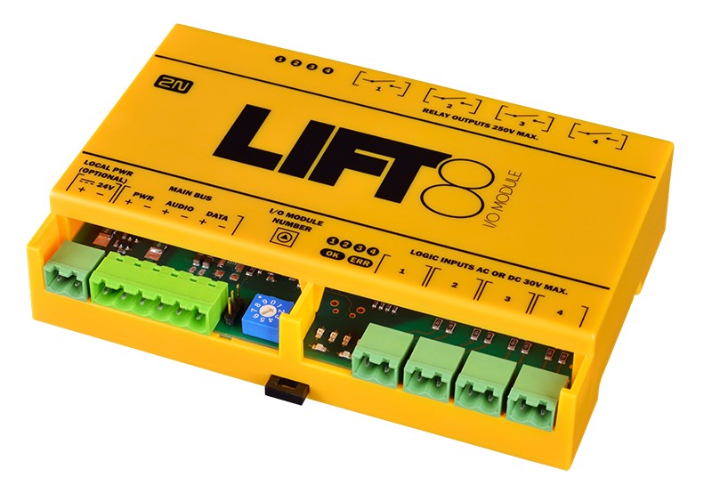 Lift8 modul se čtyřmi logickými vstupy a čtyřmi releovými výstupy, na jednu centrální jednotku lze zapojit až 8 těchto modulů.