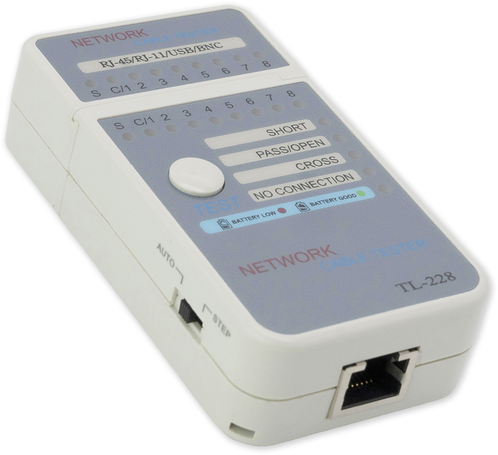Jednoduchý multifunkční tester kabelových rozvodů s výstupem pro konektory RJ45. Tester se skládá ze dvou částí a slouží k měření správného zapojení datového kabelu.