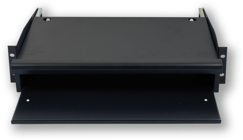 Polička výsuvná 19" pro klávesnici a myš, výška 2U, montáž do předních lišt s nosností do 20 kg, hloubka 350 mm.