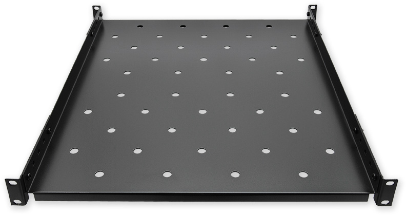 Polička 19" s perforací, výška 1U, montáž do předních lišt s nosností do 60 kg, zadní úchyty, hloubka 450 mm.