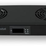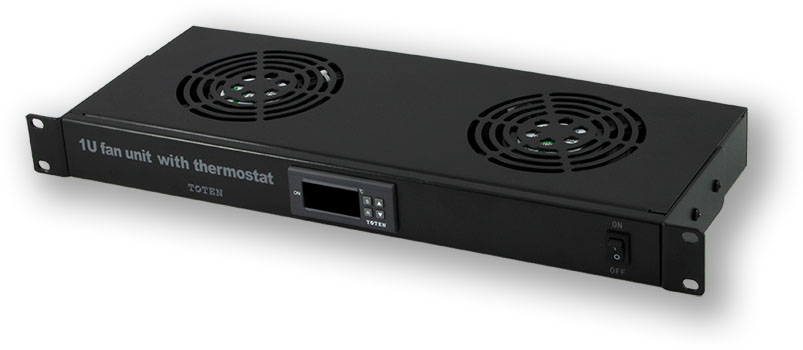 Samostatná ventilační jednotka 2 ventilátory s digitálním termostatem výšky 1U, černá barva.