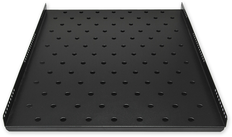 Polička 19" s perforací, výška 1U, montáž do bočních lišt s šířkou 490 mm, nosnost do 60 kg, hloubka 650 mm.