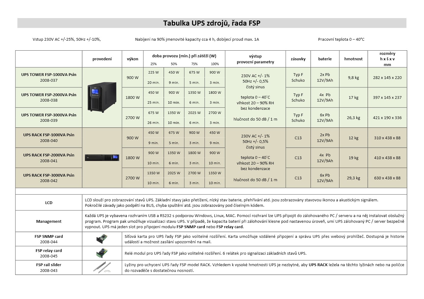 Záložní zdroj UPS TOWER FSP-2000VA Psin typu Online. Přehledný LCD displej na čelním panelu zobrazuje vstupní a výstupní hodnotu napětí, stav baterie a zatížení UPS. Místní monitoring UPS přes port USB nebo RS232. Pro dálkový monitoring je možné doplnit SNMP kartu pro připojení do sítě ethernet, nebo reléovou kartu s výstupy poruch a vstupy pro ovládání UPS.